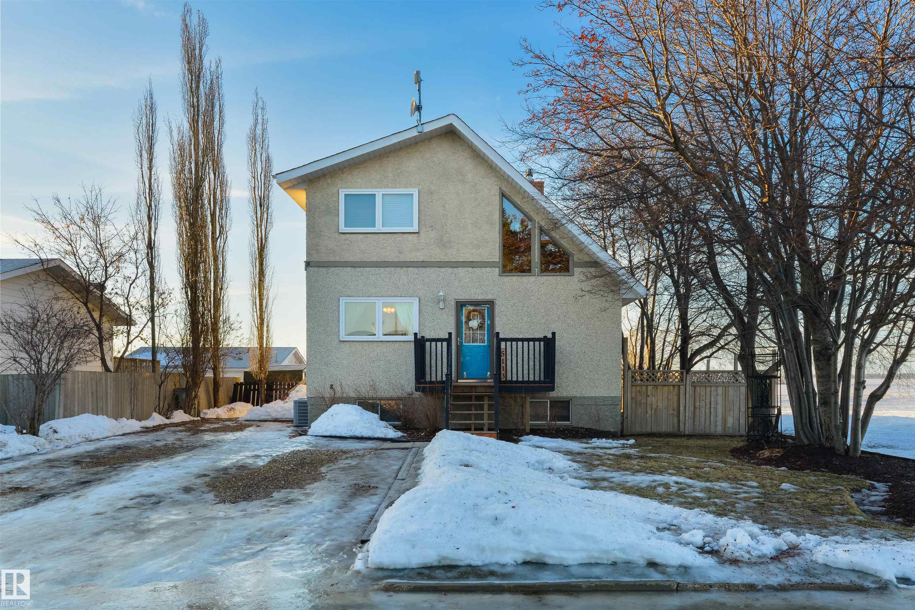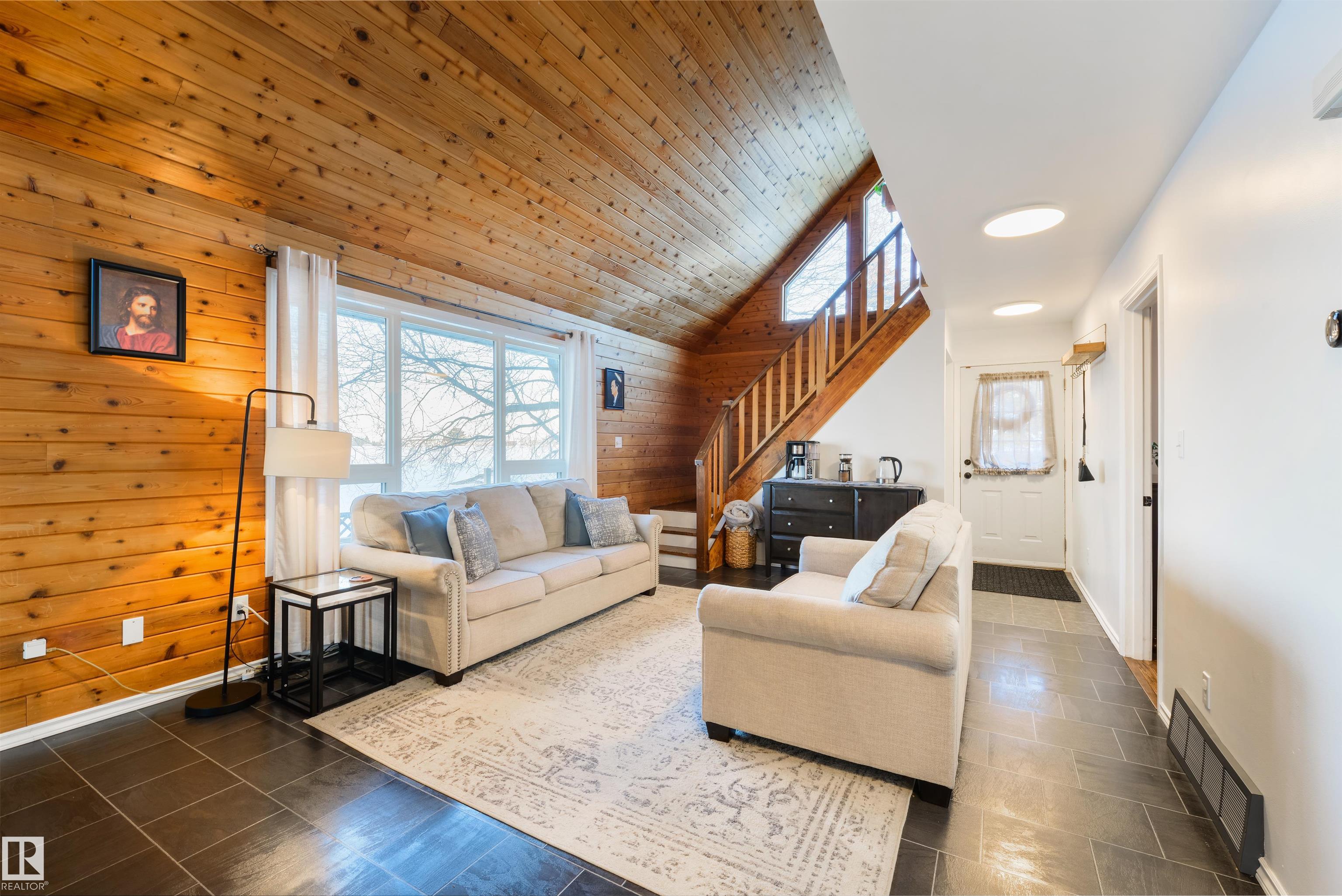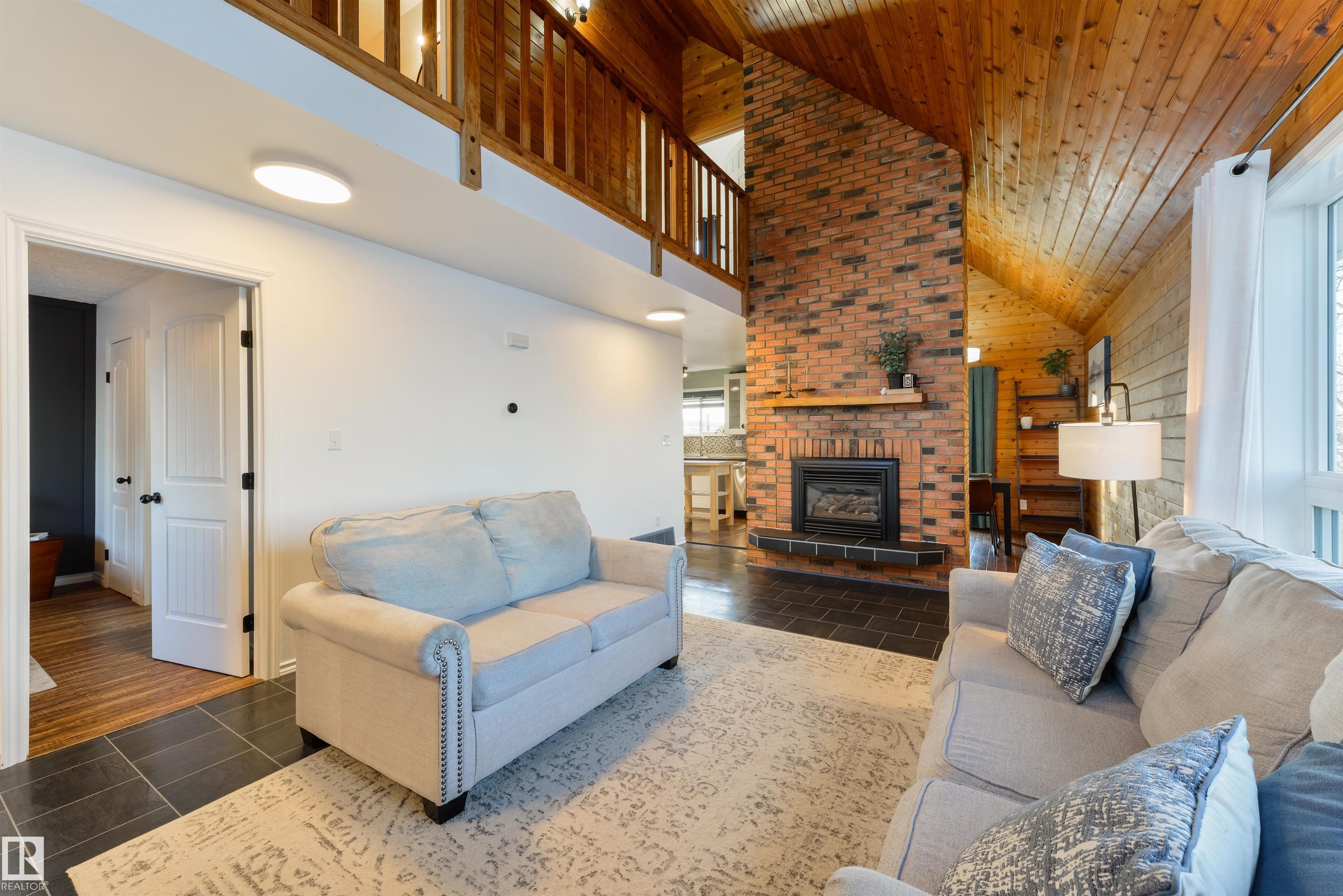A rare mid-century modern retreat where soaring wood ceilings, subtle brick accents, and wide-open views create something truly unforgettable. This fully-finished home has been incredibly well-maintained and offers space, comfort, and standout architectural character. The main floor is bright and inviting with vaulted ceilings, expansive windows, and a full-height brick-surround gas fireplace anchoring the living area. The layout flows seamlessly into the dining space and kitchen, perfect for everyday living and entertaining. Upstairs, the loft-style design adds warmth and personality, while the finished basement provides flexible space for a family room and office. Complete with main-floor laundry, dual furnaces, central A/C, and a desirable SOUTH-FACING yard, this property is partially-surrounded by open fields and offers exceptional privacy and peacefulness - an extraordinary opportunity unlike any other. MLS®: E4472690 - Legal 2 Storey $367,000